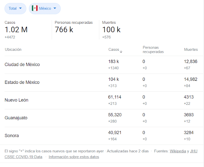 Así es banda, como se pronosticaba el país ha llegado a la terrible cifra de 100 mil muertos a causa del Covid-19, y ya hay más de un millón de casos confirmados, siendo Nuevo León, el Estado de México y la Ciudad de México, los estados más afectados.